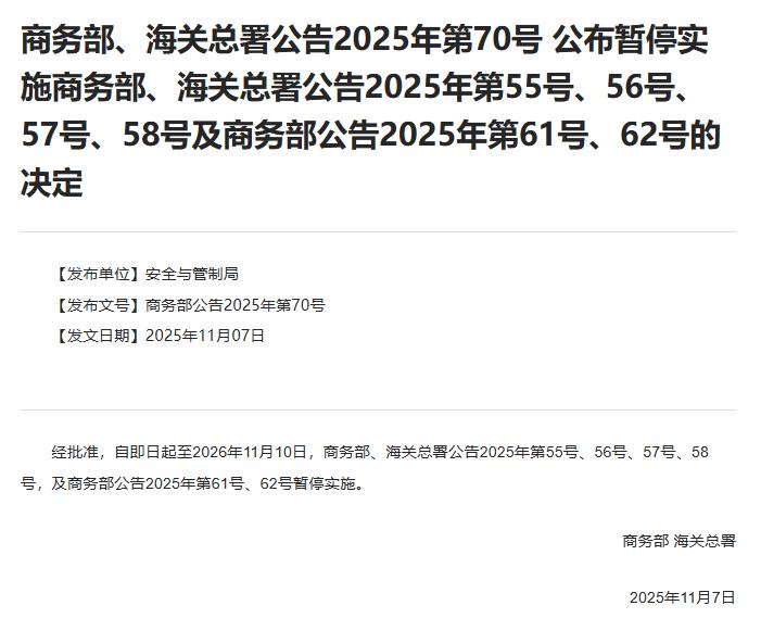 中新经纬11月7日电 据商务部网站7日消息,经批准一点金,自即日起至2026年11月10日,商务部、海关总署公告2025年第55号、56号、57号、58号,及商务部公告2025年第61号、62号暂停实施。