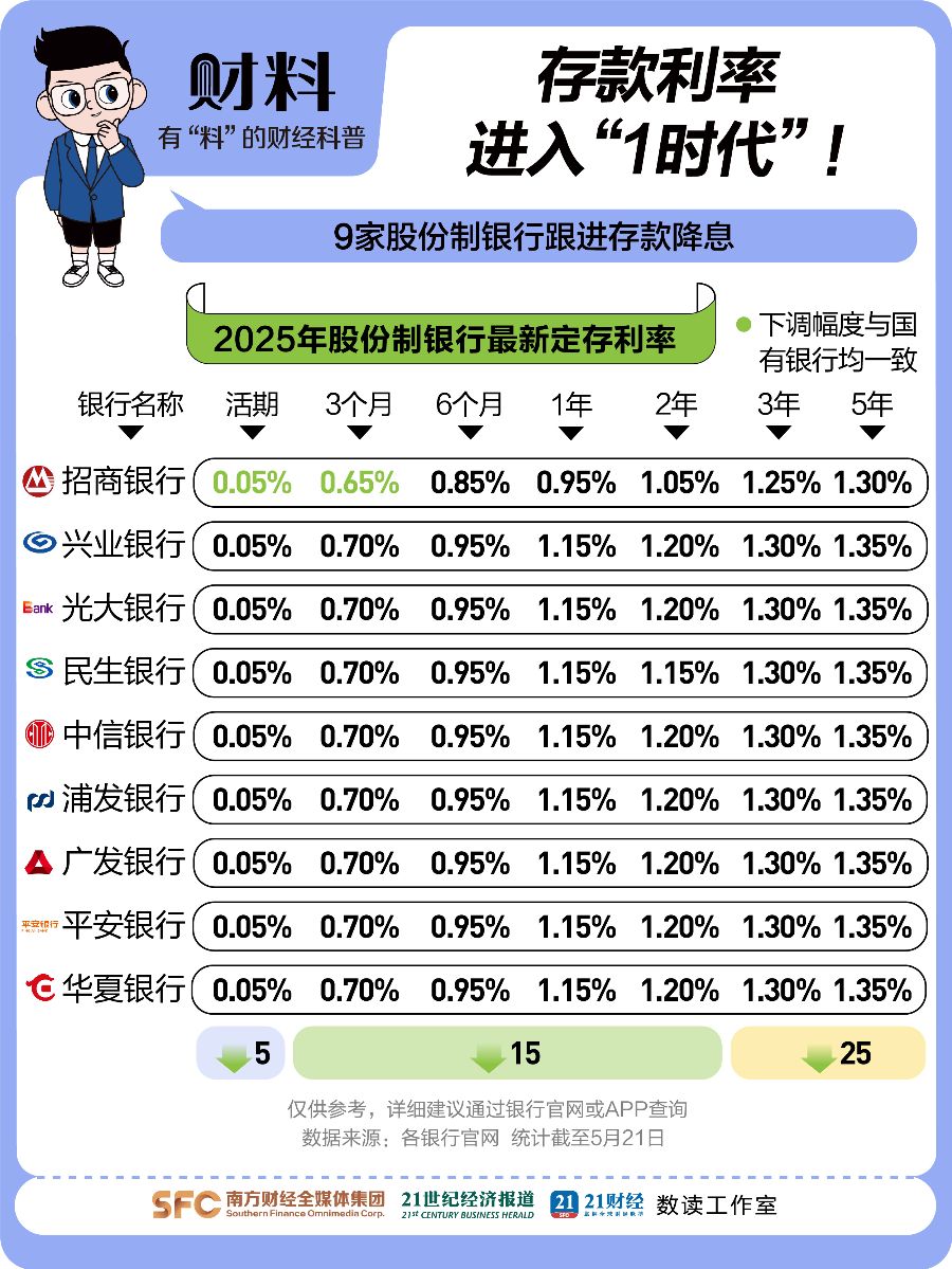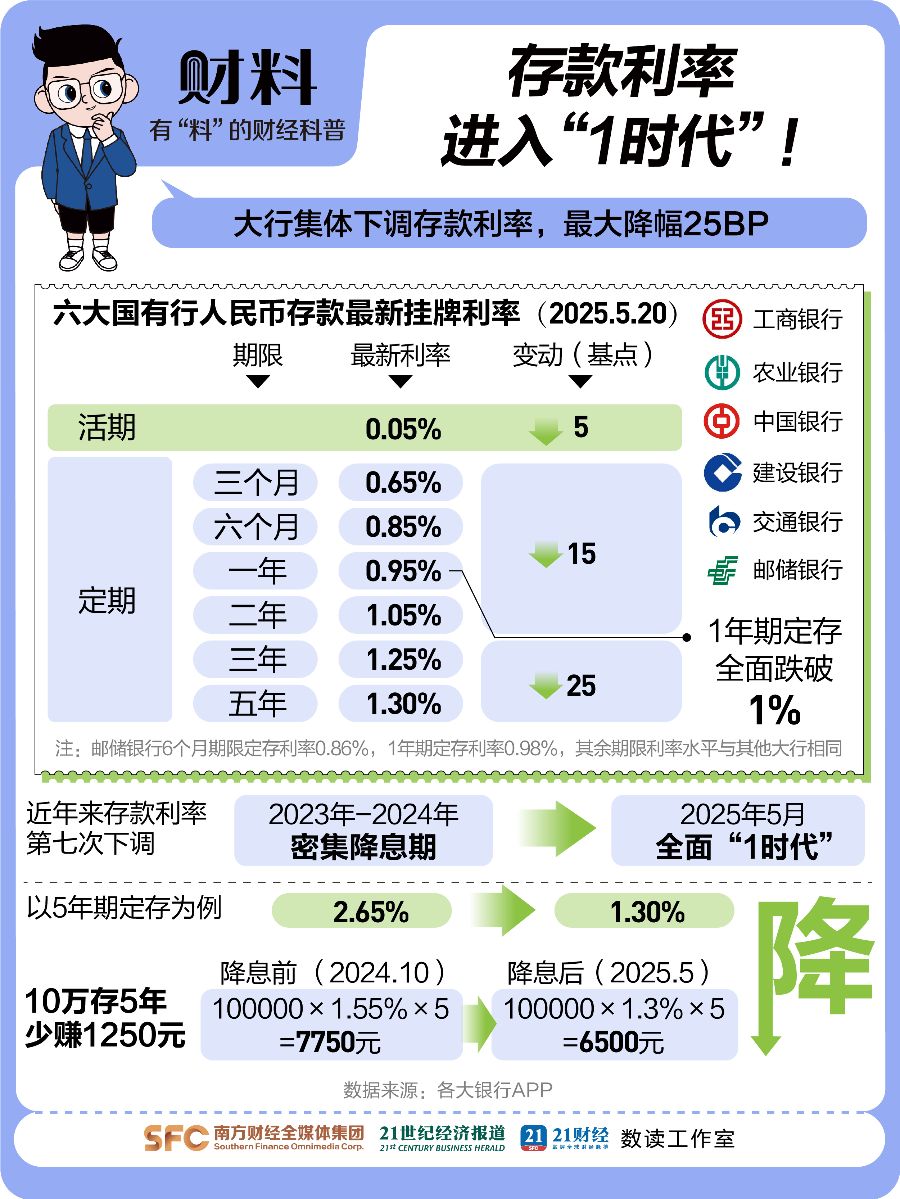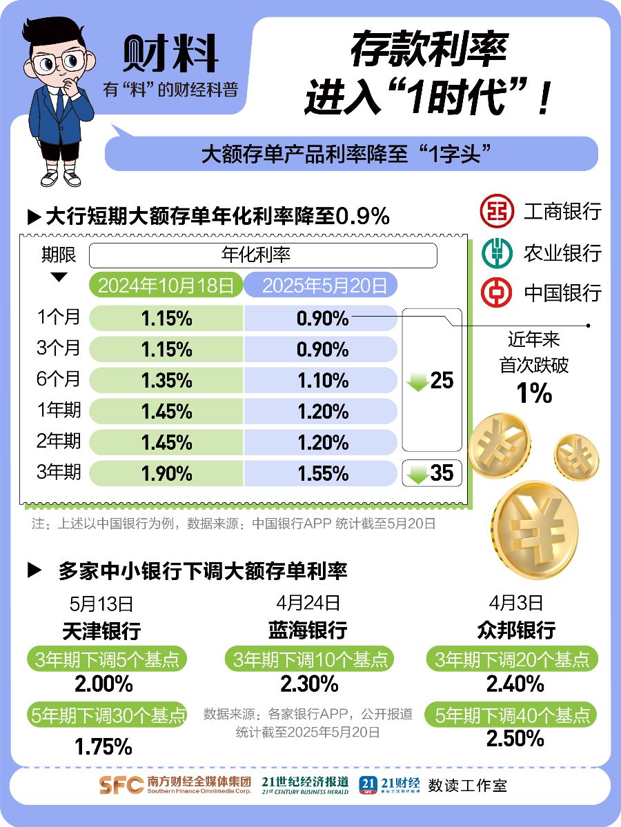 《21财料》栏目统计,5年期定存近两年降了135个基点,多个期限利率都跌破1%。5月20日,国有大行带头,1年期存款利率跌到0.95%!9家股份制银行紧跟,像平安、中信、兴业都降了。中长期利率降得狠,3年、5年期降25BP,有的银行干脆停了5年期定存。大额存单也紧跟下调,中行5月20日发售的1个月、3个月产品利率跌到0.9%,其他期限也都降了,工行、农行和一些中小银行也跟着调。